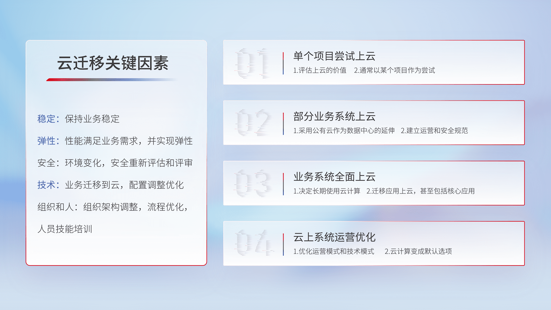 结合实际业务,,,,从规划设计、、、、云平台选型、、、、云原生改造、、数据迁移、、集成交付,,,迁移全过程为客户识别最佳上云路径,,做好风险识别管理,,设计网络架构、、身份权限、、安全审计合规、、、、操作审计、、日志审计、、、、监控告警策略、、、、多站点容灾设计等,,,,对云上基础设施进行整体规划,,提升IT治理水平,,以满足弹性、、、、高可用、、高性能的需求。。。