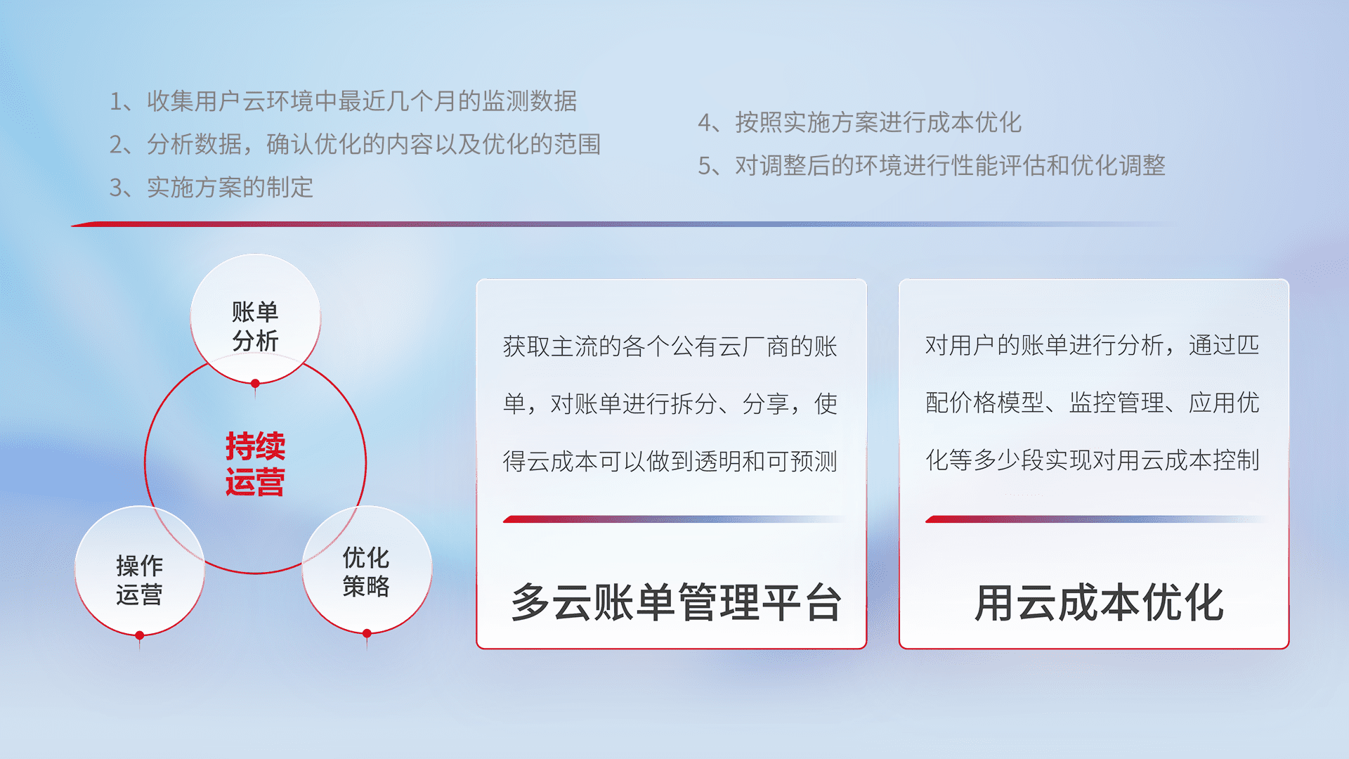 通过灵活运用多种自动化迁移工具,,帮助企业用户实现业务和数据高效 、、、、稳定的上云迁移和云上迁移,,采用自研多云纳管平台,,,,以中立管理模式,,,,解决多组织、、、、多云、、多运维厂商的复杂关系的管理,,,,保证多云平台资源配置的一致性,,,实时掌控云资源运行数据,,,运用智能化工具分析云资源多云平台的管理服务,,,,透明化管理成本支出,,,,用云成本可预测、、、用云费用可优化、、云资源配额有据可依。。。。