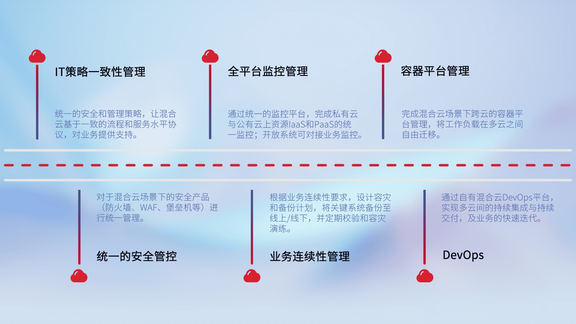 通过多云纳管,,,以统一的资源数据模型把客户的云资源进行抽象和封装,,,进而实现对多云资源的统一操作,,,,保障云资源管理的可靠性、、稳定性与可用性。。。量身定制化运维内容,,配置、、、开发运维、、补丁管理、、、备份、、、、监控、、、认证和访问管理、、、、审计和日常巡检等,,,,保障在用云过程中的可靠度,,,稳定度以及高可用率。。