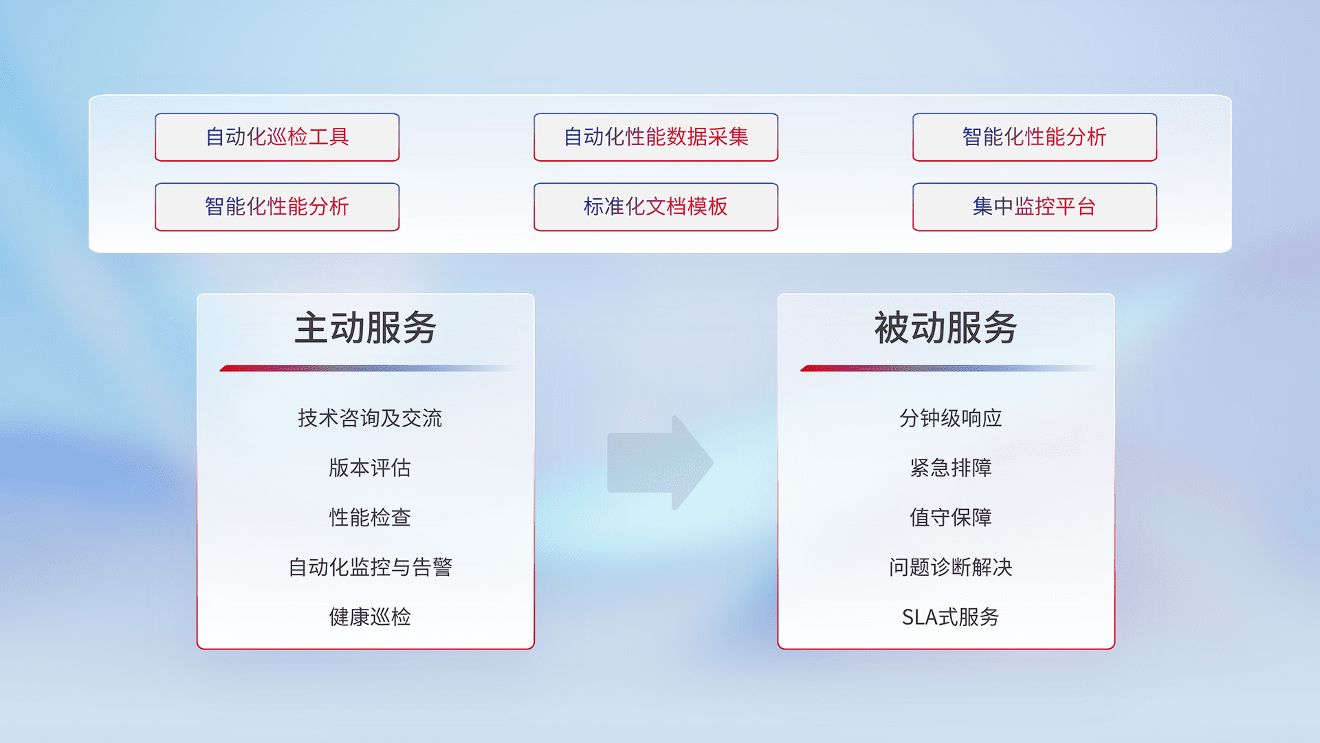 智能化工具和标准化文档,,,,保障服务质量,,,提供主动服务(包含技术咨询、、、版本评估、、性能检查、、、自动化监控与告警、、、健康巡检)和被动服务包含(分钟级响应、、、、紧急排障、、、、值守保障、、、问题诊断解决、、、、SLA服务)。。。