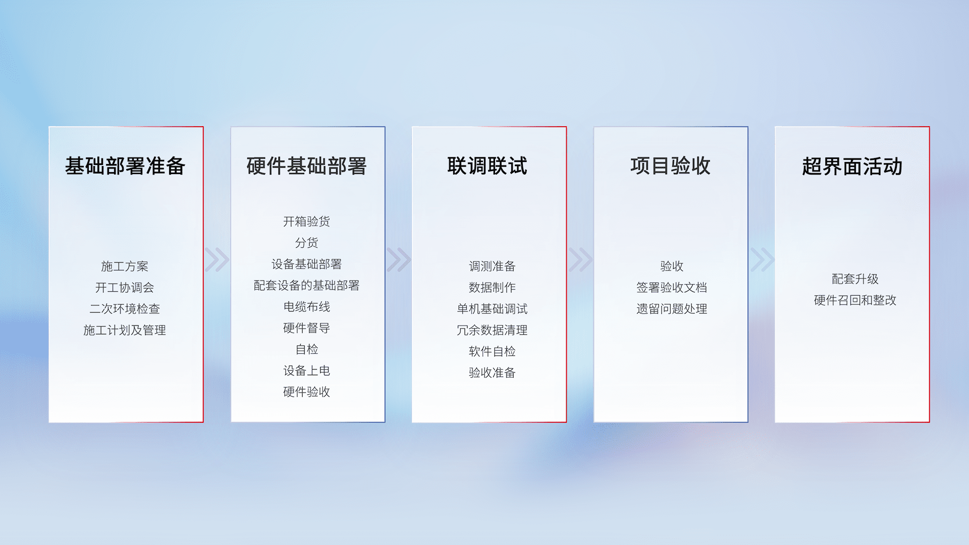 从基础部署准备、、、、硬件基础部署、、联调联试、、、项目验收、、、、越界面活动的全过程可追溯,,,保证施工质量和进度。。