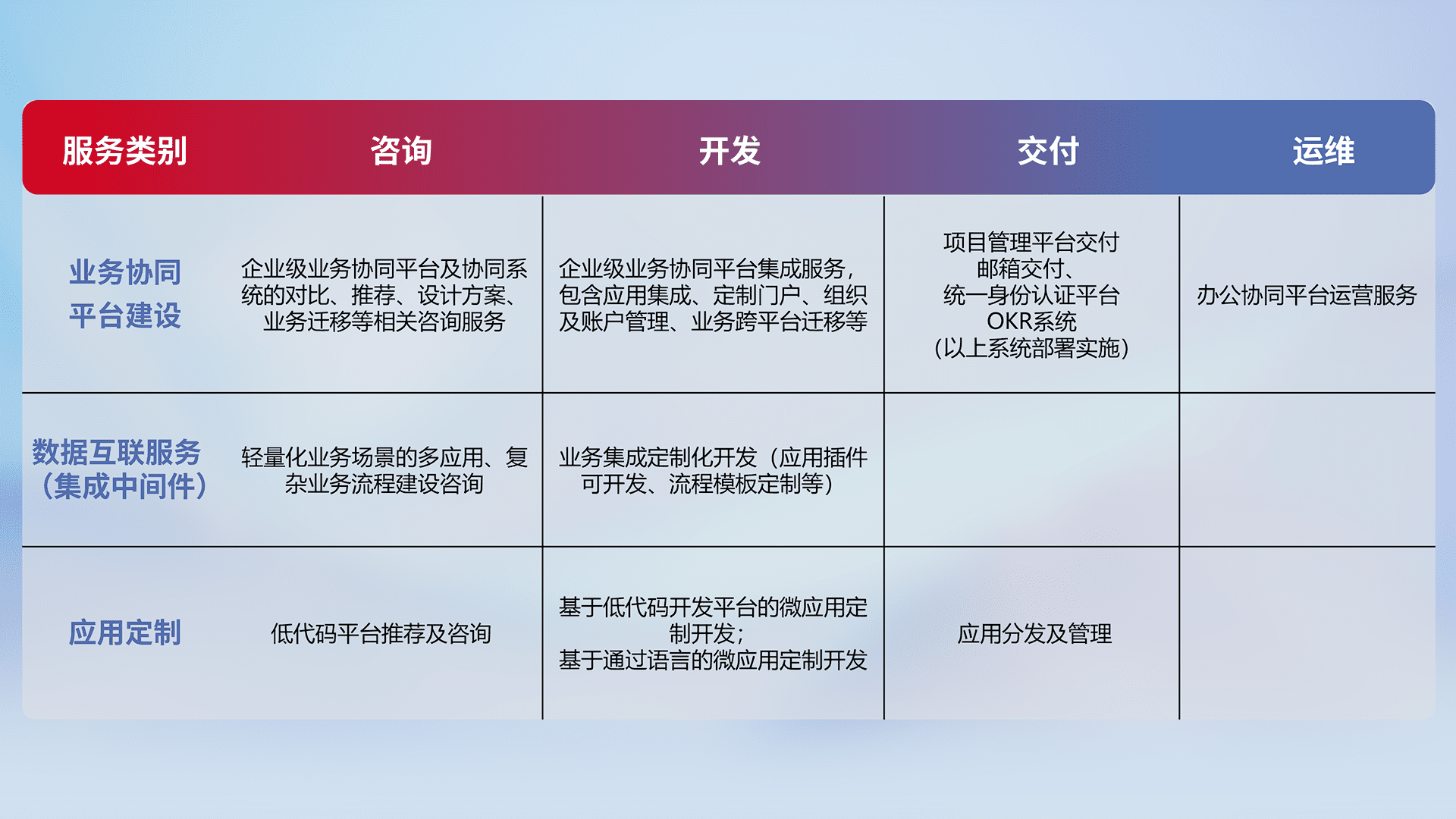 针对钉钉、、企微、、IDaas等平台级产品提供产品的规划、、方案、、、交付、、定制化开发等服务,,实现如统一协同办公、、、智能客户服务、、、混合会议管理、、、、智能数据查询、、、等业务场景,,,实现数字化转型。。。